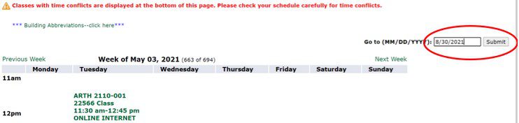 Step 2: Enter a date for Fall 2021 (ex. 8/30/2021) and click Submit.