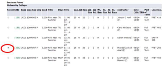 Step 5: You will see all sections of this course offered, click on the box of the section you would like to register for.