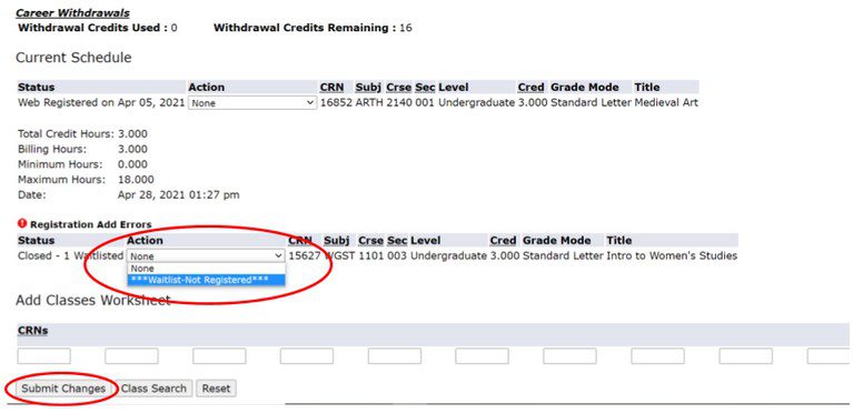 Step 5: Use the drop down menu to choose ***Waitlist – Not Registered*** and click Submit Changes to add yourself to the waitlist.