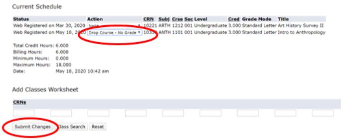 Step 8: If you want to drop a course you registered for, click on the drop down menu next to the course and select Drop Course – No Grade and click Submit Changes.